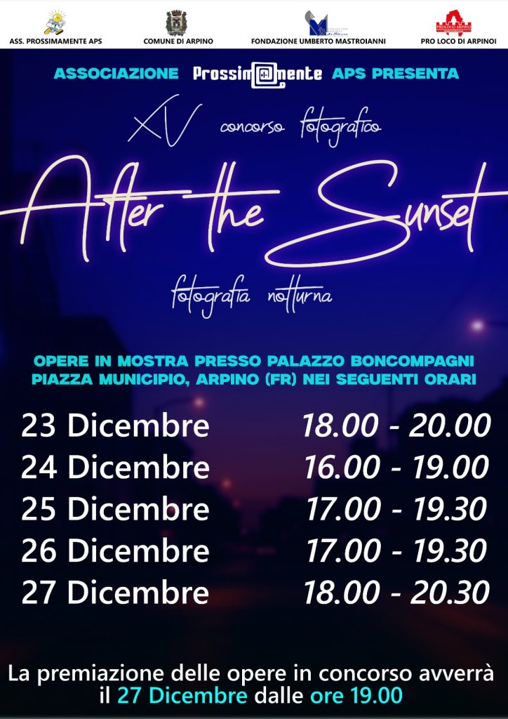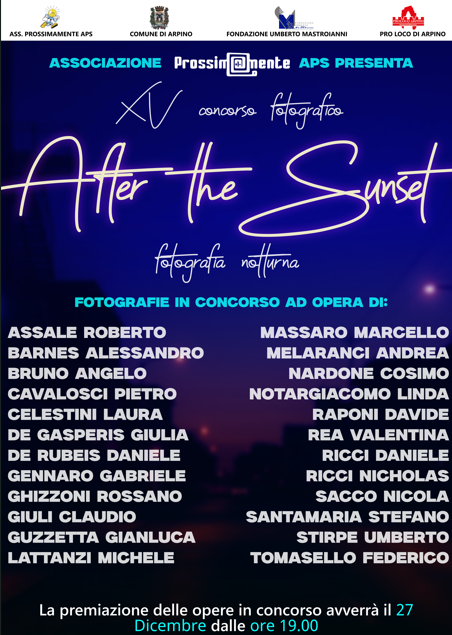 Dal 23 al 27 dicembre 2025 si terrà la quindicesima edizione del concorso fotografico dell’Associazione Prossimamente APS con ventiquattro artisti in esposizione. Il 27 dicembre è previsto l’evento finale in cui verranno premiati i vincitori delle diverse categorie del concorso. Il concorso presenta due differenti sezioni di cui la prima è a tema libero mentre la seconda è a tema obbligato dal nome “After the sunset” fotografia notturna.